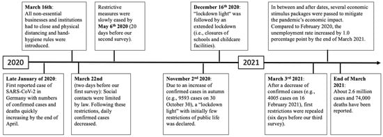 Specifically, we wanted to know (1) how mental distress and risk and protective factors changed from the first wave in 2020 to the third wave in 2021, (2) which risk and protective factors were most strongly associated with mental distress, and (3) how mental distress and psychological factors were associated with adherence to individual health-protective behaviors. Since the measures imposed by the German government are likely important to the adherence to individual health-protective behaviors and mental distress, we show the timeline of the most important measures and dates to our research in Figure 1. To answer these questions, we used data from three large cross-sectional samples (N > 900 each), representative of the German population on key variables, collected between March 2020 and March 2021 at different stages of the pandemic.