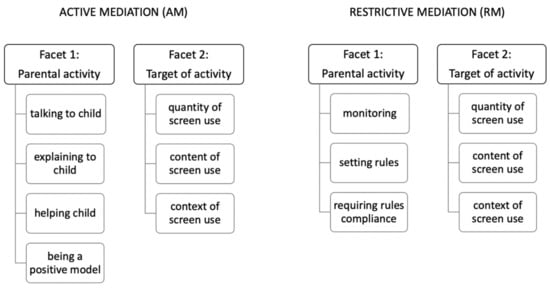 The concept of media parenting, often called ‘parental mediation’ [], is grounded in media consumption research, which has developed in the context of increasing television consumption in children during the second half of the last century. Despite the fact that there is not one predominant theory on parental mediation, scholars usually distinguish between two related but distinct factors: ‘active’ and ‘restrictive’ mediation. Active mediation (AM) originally reflected to what extent parents discussed the content of media with their child [], but has been broadened to reflect general levels of communication about media and also shared experiences of media use between parent and a child []. Restrictive mediation (RM) reflects mostly parental practices of developing and implying regulative rules over child’s media use [,,]. These two concepts (AM and RM) have been adopted by scholars focusing on new media such as the internet or games [,].