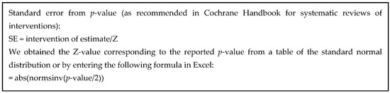 In this analysis, we only considered the direct path showing the effect of each predictor on the outcome. We also considered only the unadjusted effects whenever possible. By dividing the effect estimate (beta coefficient) by its standard error, we calculated the z-score for each study and each predictor. If the uncertainty parameter associated with the beta estimate was a p-value or confidence interval, we applied a formula (Figure 1) to convert them into standard errors. We plotted the z-scores per predictor type which enabled graphical discrimination of those associated with significantly increasing or decreasing occupational burnout rate. We further implemented the vote-counting method to identify the predominant direction of effect within a group of predictors [46]. In this analysis, the number of studies showing harmful effects was compared with the number of studies showing protective effects, regardless of the statistical significance [47]. The statistical significance of the predominant effect was then tested using the binomial test [46]. This method enabled us to test whether the subfamily effect was harmful (or protective) in less than 50% of studies. Finally, we computed effect sizes by extracting the correlation coefficients (for each exposure at time 1 correlating with the outcome at time 2), and then we used the formula suggested by Cohen [48]. An effect size less than or equal to 0.02, 0.15, 0.35 can be considered as “small”, “medium”, and “large”, respectively. We used R 3.6.2 statistical software (R Foundation for Statistical Computing, Vienna, Austria) for generating z-plots and STATA version 16.1 (StataCorp. LP, College Station, TX, USA) for all other analyses.