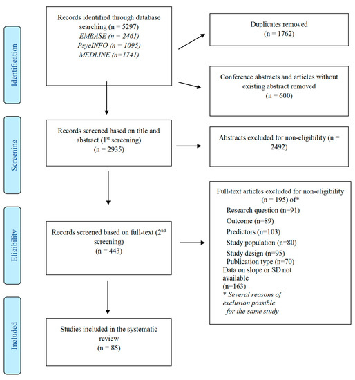 Figure 2 Summarizes the study selection process. From 5297 identified references, 2935 were screened based on the title and abstract after duplicates, conference abstracts, and articles without abstracts had been removed. The rate of disagreement between reviewers regarding the eligibility of abstracts was less than 20%, and once solved, 443 references were retained for the full-text screening. In this step, the rate of disagreement regarding the eligibility of studies was less than 9%, and once solved, 85 articles were finally included in the review (Figure 2, and Table S1).