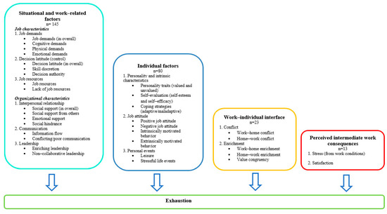 First, we sorted and grouped all predictors into families corresponding to similar constructs or using similar measures. This enabled us to synthesize the abundant amount of information and make each family of predictors as homogeneous as possible. For example, based on a review on job burnout [43], we considered two main families of predictors: situational and individual. Job characteristics and organizational characteristics were included in the former, whereas personality characteristics and work attitudes were included in the latter. Non-occupational factors were grouped based on the type of predictor. Moreover, at the intersection between work and personal life, we considered a third family of predictors, the work-life interface [44,45], which refers to factors of personal life that overlap with work factors or vice versa. Finally, we classified other variables, either considered as predictors of occupational burnout not included in the other three main families or as intermediate outcomes or consequences of some working conditions, such as stress or satisfaction, in a fourth main family named “Perceived intermediate work consequences”. Secondly, we categorized predictors within each family into subfamilies in order that all predictors of one subfamily meet the conditions as follows: 1—related to the same or similar construct; 2—had the same theoretical valence/direction (e.g., two subfamilies “maladaptive coping style” and “adaptive coping style” instead of one subfamily “coping style”).