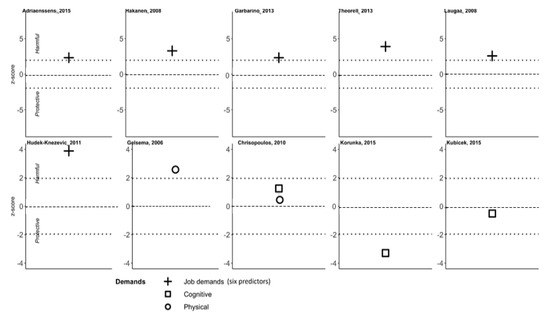 In this review, we identified 261 predictors, which we grouped into four families and 13 subfamilies). Figure 3 depicts the content of each family of predictors, while Table S2 provides the definitions of predictors within each family and/or subfamily and their theoretical background. For each family and subfamily of predictors, we plotted z-scores calculated from studies investigating these predictors. Figure 4 shows that ten plots corresponding to 10 studies investigating at least one of the predictors belonging to the Job demands subfamily, Cognitive demands, and Physical demands subfamilies are presented together to facilitate the overall view of the z-scores distribution in this family of predictors. Z-score values higher than zero correspond to a positive association between the predictor and exhaustion, which is labeled as a harmful effect. Conversely, z-score values less than zero correspond to a negative association between the predictor and exhaustion, which is labeled as a protective effect. If the value of the predictor is outside the 95%CI (i.e., 1.96, −1.96; indicated by the dotted lines in Figure 4) then the effect is statistically significant. At zero, there is no association between the predictor and outcome (exhaustion). Figure 4 thus shows that within the Job demands subfamily, three studies [62,68,69] out of ten found a significantly harmful effect of high job demands overall with respect to exhaustion increase, and three studies [12,54,70] found this effect at borderline statistical significance. Gelsema et al. [52] found that physical job demand was harmful, while Korunka et al., found that Cognitive job demand was protective against exhaustion [71], and two other studies were inconclusive [61,63]. The complete set of plots for all (sub)families of predictors are available in Table S3.