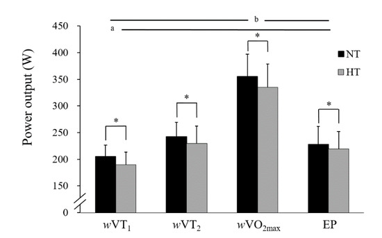 Previous studies have suggested that HT has negative effects on individuals’ exercise performance compared with NT [2,5,23]. One study demonstrated that the power outputs corresponding to maximal lactate steady-state and VT were lower at temperatures of 40 °C than at 23 °C [2]. The present study observed that wVO2max under HT was approximately 5.6% lower than under NT. Moreover, the workload at sub-maximal exercise intensities under HT were lower than under NT. Therefore, coaches and athletes should carefully consider the declines in exercise economy and/or efficiency when competing or training in HT conditions.
