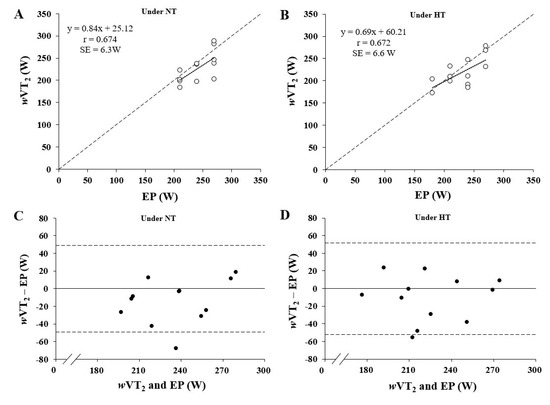Correlation (A,B) and Bland–Altman plot (C,D) analyses for power differences between the second ventilatory threshold (VT2) and the end power (EP) during 3-min all-out test under thermoneutral temperature (NT) and high temperature (HT). In panels (A,B), the solid line is the best-fit linear regression and the dashed line is the line of identity. In panels (C,D), the solid line represents the mean difference between the two trials, and the dashed line represents the 95% limits of agreement.