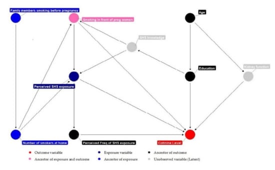 Data were analysed using frequency distributions and descriptive statistics. Before performing regression analyses, t-tests, Pearson’s correlations, or Spearman rank correlation were used to analyse the relationships among the variables. A two-step model-building procedure was used to determine variables to assess the correlates of subjective to objective SHS exposure (urinary cotinine levels) in a multivariate regression model. In the first step, the variable selection was based on a causal path diagram created using R programs using the directed acyclic graph (DAG) approach []. Covariates were selected based on the recent literature [,,,], known correlates for SHS exposure in pregnant women, and hypothesised relationships. The body mass index (BMI) was not included in the statistical model for two reasons: (1) Baltar et al. found that the BMI was inversely associated with cotinine concentration levels; however, this relationship was not observed in non-smokers []; (2) There is no strong evidence that the BMI causally influences cotinine levels []. Using the DAG approach, a priori model of the postulated relationships between SHS exposure, urinary cotinine levels, and covariates was established. By adjusting for these factors, the effect of all the described covariates in Figure 1 on the urinary cotinine levels was investigated. Thereafter, univariate analyses were conducted to determine the unadjusted associations between subjective and objective SHS exposure and potential correlates. In the second step, as recommended by Hosmer et al. [], only the variables associated with urinary cotinine levels (p < 0.25) were included in the multivariate model. Statistical significance was set at p < 0.05. Data analyses were conducted using SPSS 25 (IBM SPSS Inc., Chicago, IL, USA).