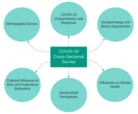 The ad hoc survey was developed across both countries to address self-reported perceptions of student life during the pandemic. Themes assessed are consistent with those from a recent COVID-19 survey in youth around social and behavioral influences [13]. In our survey, participants were asked 40 questions, which collated around the following topics: (1) demographics (e.g., age, employment), (2) COVID-19 physical characteristics and response, e.g., test availability, (3) symptomatology and illness experiences including number and type of symptoms, (4) cultural influence on risk and protective behaviors such as sanitization procedures, personal protective equipment (PPE) use, (5) social world perceptions, i.e., social relationship activity, and (6) influences on mental health (Figure 1). Questions consisted of multiple-choice, multiple answers, ordinal scale, and open-ended.