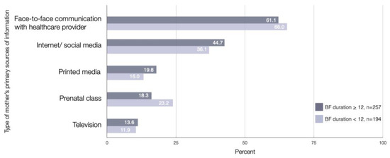 The majority of mothers who continued breastfeeding at one year postpartum reported that face-to-face communication with healthcare providers (61.1%) and internet and social media (44.7%) were the important communication types that influenced breastfeeding practice at one year. In comparison, only one-fifth of the participants received information related to extended breastfeeding from printed media (19.8%) and prenatal class conferences (18.3%). Television was less often reported as the source of information (13.6%). There was no significant association between all mother’s primary sources of information and continued breastfeeding at one year postpartum (Figure 2).