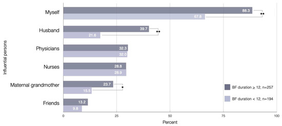 Influential persons who impacted the decision to continue breastfeeding, as identified by mothers who continued and not continued breastfeeding at one year postpartum (n = 257, n = 194); * significant association at p < 0.05; ** significant association at p < 0.01.