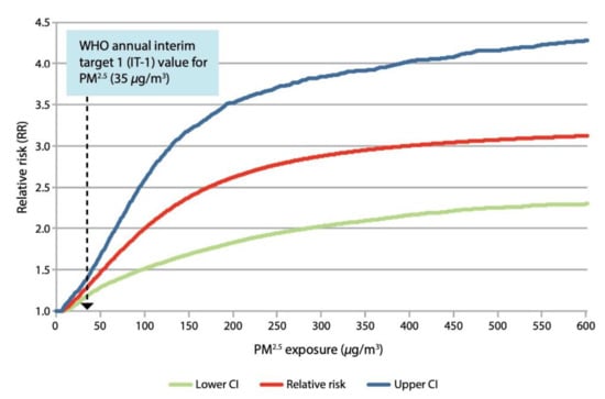 Relationship between the level of PM2.5 exposure (µg/m3) and the relative risk (95% CI) of child ALRI, based on the integrated exposure–response function, for exposure over the range 0–600 µg/m3. Source: WHO (2014) WHO Guidelines for Indoor Air Quality. Geneva. Household Fuel Combustion. p. 43. https://apps.who.int/iris/handle/10665/141496 (last accessed on 30 August 2021) CC BY-NC-SA 3.0 IGO.