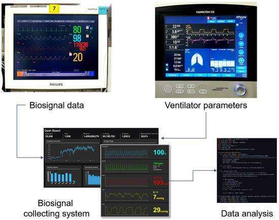 We collected clinical and biosignal data from patients who were admitted to the ICU and underwent MV at Ajou University Hospital, a tertiary teaching hospital in South Korea, from January 2019 to November 2020. Clinical data obtained from electronic medical records and biosignal data were collected using our custom biosignal collecting platform, which we developed for research purposes [68]. We also collected ventilator parameters directly from the ventilators following every SBT to accurately identify the breathing patterns and their variability (Figure 1).