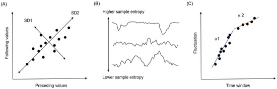 Methods used for the feature extraction process. (A) Poincaré plot, (B) Sample entropy, and (C) Detrended fluctuation analysis. All three approaches evaluate the level of variability in time-series data. For numerical values, the Poincaré plot method was used; for waveform data, sample entropy and detrended fluctuation analysis methods were used.
