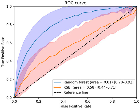 When the RSBI value alone was used for weaning prediction, its AUROC was 0.58 (95% confidence interval: 0.44–0.71). When the biosignal-based features were combined with RSBI for weaning prediction, the AUROC value increased to 0.81 (95% confidence interval: 0.70–0.92). The performance comparison of the models (based on biosignals with the RSBI score and based on RSBI alone) is shown in Table 3. The combined model demonstrated improved specificity (+26%), accuracy (+4%), negative predictive value (+18%), and F1 score (+23%), with a similar level of sensitivity. The details of model performance are provided in Table 3 and Figure 4.