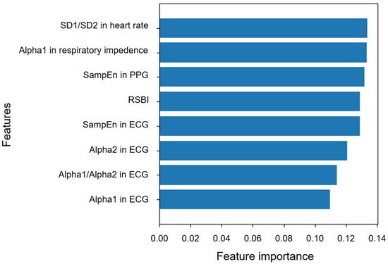 As shown in Figure 5, biosignal-based features selected in this study exhibited value similar to the existing RSBI for predicting weaning success in the Random Forest model. In particular, SD1/SD2 in heart rate, α1 in respiration impedance, and SampEn in PPG were more valuable than RSBI.