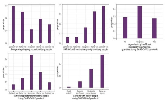 Acknowledging that the elderly and persons with underlying health conditions are more susceptible to COVID-19, a growing number of stores around the world were dedicating time or opening earlier for senior shoppers [,]. Special shopping hours, dedicated to older adults who are among the most vulnerable to severe complications from COVID-19, were set in Poland by government decision from 10 to 12. Thus, only people over 60 years of age could do shopping at this time in Poland. In our study, 50% of the respondents were against setting shopping hours for the elderly. Women more often than men did not agree with this policy. Policy compliance increased with age and was strongly associated with the relevance of contacts with the elderly. As the practice of social distancing became the norm, the special hours at supermarkets could further limit coronavirus exposure for older shoppers who chose to go out, which put them more at risk of infection. Nevertheless, appointing hours only for seniors aroused various emotions in many Poles. Not everyone was satisfied with this state of affairs, especially that most of the seniors could ask family, friends or neighbors to do shopping for them.