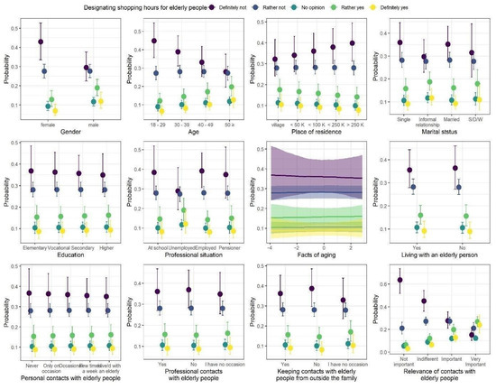 The model coefficients of the ordinal regression with responses to questions about designated shopping hours for elderly people are summarized in Table 4, whereas the model predictions are presented in Figure 2. We observed three statistically credible relationships with responses to the questions. First, women tended to disagree with the policy more often, as the proportion of “definitely not” responses was much higher among them, as compared to the frequency of this response among men. Second, agreeableness to the policy increases with age, as indicated by credibly decreasing proportions of “definitely not” answers to the questions as the age of the respondents increased, while the proportions of “rather yes” and “definitely yes” responses increased with age. Finally, responses to the questions were also credibly and strongly related to the relevance of contacts with elderly people. As the relevance increased, the proportion of responses “definitely not” strongly decreased, and proportions of responses “rather yes” and “definitely yes” slightly increased.
