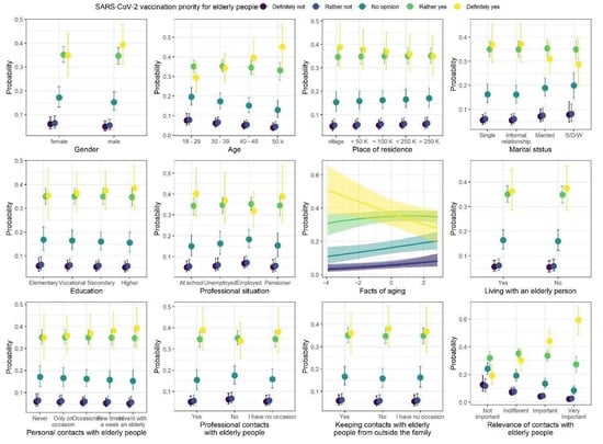 It was possible to predict the dependencies, according to which with the growing importance of contacts with the elderly, the percentage of answers “definitely yes” increased significantly, and “definitely no” and “probably not” decreased. These results indicate that people attached to the elderly are aware of the need to protect seniors from the consequences of the COVID-19 pandemic. Taking into account the fact that knowledge about vaccination against SARS-CoV-2 is constantly developing [], this may mean the growth of a positive phenomenon in which the awareness of the very large impact of vaccination on the health of the elderly will increase, and people who will be particularly alarmed will be those for whom the well-being of seniors is extremely important.