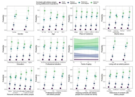 The model coefficients of the ordinal regression with responses to questions regarding contacts with elderly people during the COVID-19 pandemic are summarized in Table 8, whereas the model predictions are presented in Figure 6. We observed five statistically credible relationships with responses to the questions. First, gender was credibly related to the pattern of contact with elderly people, with higher proportions of “same as before” answers and lower proportions of “reduce to some degree/significantly” answers among males than among females. Second, the proportion of “same as before” answers credibly decreased, and proportions of “reduce to some degree/significantly” answers credibly increased, as the age of the respondents increased. Third, marital status was credibly related to answers to the questions, with the lowest proportion of “same as before” and highest proportion of “reduce significantly” answers among people in informal relationships. Fourth, as frequency of personal contacts with elderly people increased, the proportion of “same as before” answers credibly increased, and proportions of “reduce to some degree/significantly” answers decreased. Finally, keeping contacts with elderly people from outside the family was also credibly related to the answers to the questions.