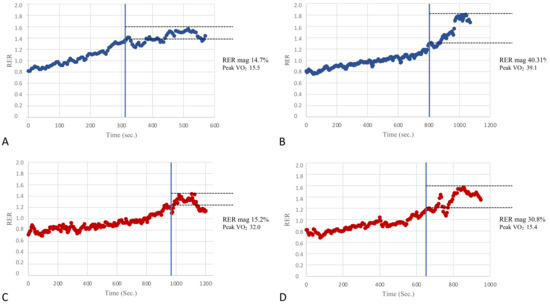 A few visual examples of the RER mag. Panels (A,B) show two examples of poor (14.7%) and good (40.31%) RER mag in patients of our population with relatively poor and good cardiovascular fitness as per the peak VO2 (Weber’s class C and A, respectively). On the other hand, panels (C,D) show two examples of a poor (15.2%) and good (30.8%) RER mag in patients with relatively good and poor cardiovascular fitness (Weber’s class A and C, respectively). The RER mag appears to be significantly correlated with cardiorespiratory fitness in the present study; however, this figure suggests that it might also be useful to add the RER overshoot information in the CPET evaluation of patients even in the presence of a normal aerobic capacity and vice-versa.