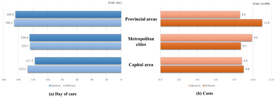 The average number of days of care and healthcare costs are shown in the Supplementary Table S1. In patients who received treatment in hospitals located inside their residing area, days of care were lowest in those residing in the capital area. In patients who received treatment in hospitals located outside their residing area, days of care were lowest in those residing in metropolitan cities (Figure 2).