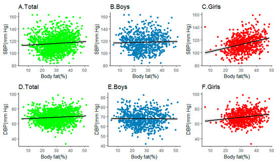 Multivariable relationships between SBP or DBP with BF%among children and adolescents. Note: (A–C) represent the relationship between SBP with BF% in total, boys and girls; (D–F) represent the relation-ship between DBP with BF% in total, boys and girls.