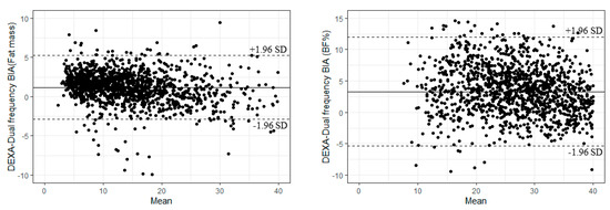 As shown in Figure 2, based on Bland–Altman plots, although within the limits of agreement (mean ± 1.96 (SD)), the values less than a mean of 2.03% body fat mass were over-predicted and the values above 2.73% were under-predicted with the DEXA and dual-frequency BIA machine measurements. A similar trend was observed for BF%, where most of the participants were within the limits of agreement (2.24% BF% were over-predicted, 1.40% were under-predicted).