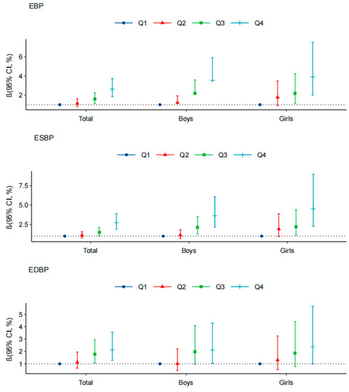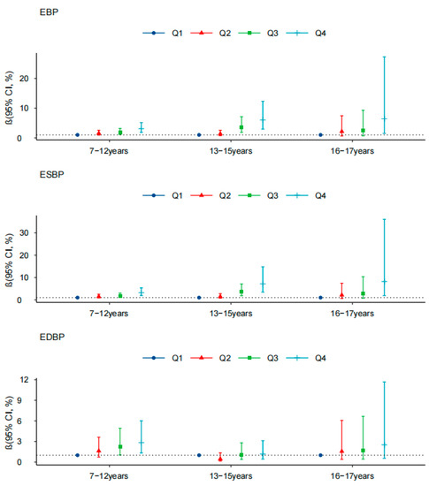 The averages of SBP and DBP values were calculated by two measurements. According to the national reference of EBP in China [17], ESBP (elevated systolic blood pressure) and EDBP (elevated diastolic blood pressure) were defined as average measured SBP and DBP greater than or equal to the 90th percentile (on the basis of age, sex, and height percentiles), respectively. EBP was defined as ESBP or EDBP of children and adolescents. BF% was divided into quartiles based on the P25, P50, and P75 cutoff value among participants of this study. According to the quartile method, we divided the BF% into Q1 (1–25th percentile), Q2 (26–50th percentile), Q3 (51–75th percentile), and Q4 (76–100th percentile).