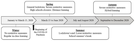 Timeline of the year 2020 in regard to the COVID-19 restrictive measures and the schooling situation. * In the Montreal area, restrictive measures due to the COVID-19 pandemic started on 13 March 2020.