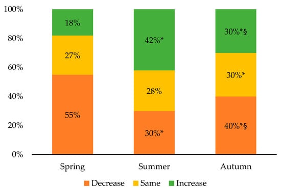 Evolution of physical activity practice compared to the winter 2020. * Significantly different from the spring; § Significantly different from the summer; p < 0.01.