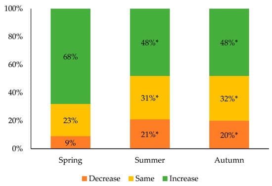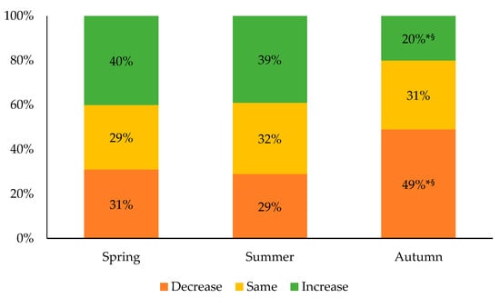 Most of the participants (55%) reported a decrease in their PA practice during the spring of either a slight decrease (29%) or a significant decrease (26%), as shown in Figure 2. During that same period, 18% of the participants reported an increase in their PA practice of either a slight increase (11%) or a significant increase (7%). In the summer, 30% of the participants reported a decrease in their PA practice in comparison with the winter (21% reported a slight decrease and 9% a significant decrease), while 42% of them reported an increase (28% reported a slight increase and 14% a significant increase). In the autumn, 40% of the participants experienced a decrease in their PA practice compared to the winter, with 25% of them reporting a slight decrease and 15% a significant decrease. Over that same period, 30% of the participants reported an increase in their PA practice compared to the winter, with either a slight increase (22%) or a significant increase (8%). It should be noted that a significant gender effect was only observed during the spring, while a larger proportion of girls reported experiencing changes in their PA practice than boys or gender-diverse participants (77%, 71%, and 61%, respectively; p < 0.001).