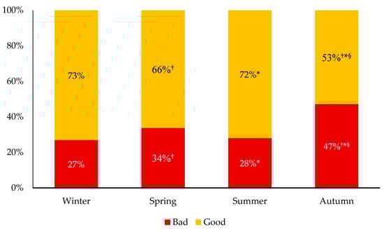 Evolution of sleep quality from the winter 2020 to the autumn 2020. † Significantly different from the winter; * significantly different from the spring; § significantly different from the summer; p < 0.001.
