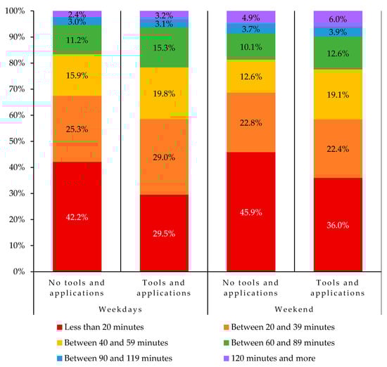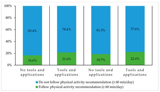 Regarding the use of technology while practicing PA, 40.8% of the participants reported using a tool or an application over the last month. An association between the use of a PA-related technology and the actual PA level of the participants was observed (p < 0.001), as shown in Figure 6. That is, lower proportions of participants using those types of tools or applications reported practicing less than 20 min of PA per day, for both during the week and the weekend, compared to other participants. Moreover, higher proportions of participants who used a PA-related tool or application reported meeting the PA recommendation, for both the week and weekend, compared to other participants (see Figure 7). The most popular categories of PA tools and applications were exercise inspiration (22.6%), tracking (18.9%), training exercises (14.1%), and watches (11.9%). Participants indicated using these technologies to track their PA (46.9%), to track their progress (32.1%), to find suggestions of new exercises (28.4%), to pass the time when they were bored (25.9%), and to count the calories burned while exercising (19.5%).