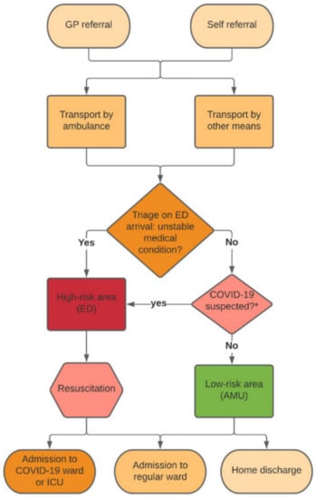 Flowchart of pre-triage screening COVID-19 suspected patients in the emergency department. GP, general practitioner; ED, emergency department; AMU, acute medical unit; ICU, intensive care unit. * Based on latest guidelines concerning symptoms, known COVID-19 contacts and travel history. Figure adapted from Barten et al. [].