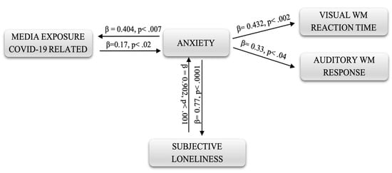 Path analysis was performed to estimate the links between variables and to provide information on the underlying causal processes. The first was related to the reaction time of WM. From the analyses carried out, not all of the hypothesized links emerged as significant; therefore, some of them were eliminated, such as social distancing and media exposure.