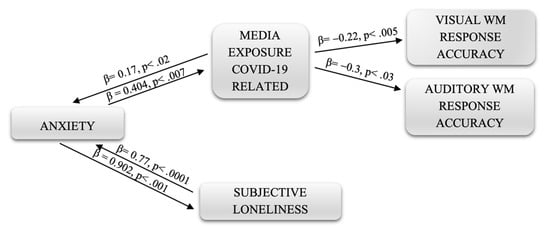 The path diagram of Figure 2, related to correct WM responses, shows the direct and reciprocal relationship between the same variables (anxiety, COVID-19 media exposure and perceived isolation). In this second case, the role of media exposure to coronavirus-related content is highlighted as an intervening variable that has a direct negative effect on the accuracy of responses to visual and auditory WM tasks. Specifically, the value relating to the effects of exposure to media relating to COVID-19 on the percentage of correctness of the visual working memory responses is greater (β = 0.22, p < 0.005) than that relating to the effects on the accuracy of responses to auditory n-back tasks (β = 0.31, p < 0.03).