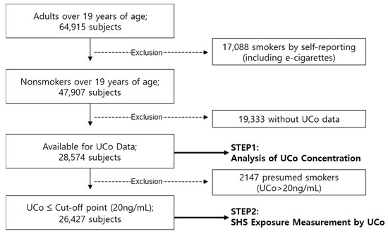 - Kim, J.; Lee, K. Characterization of urinary cotinine in non-smoking residents in smoke-free homes in the Korean National Environmental Health Survey (KoNEHS). BMC Public Health 2016, 16, 538. [Google Scholar] [CrossRef] [Green Version]