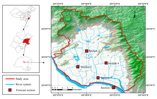 Urban rivers are important parts of urban landscapes and drainage systems. In the non-flood season, rivers need to maintain water levels that meet the requirements of the landscape and ecology [1]. In flood season, as the outlet of drainage networks, rivers need to lower the water levels to ensure smooth drainage [2]. Through the construction of a mathematical model and real-time forecast system, the future river water regime can be forecasted, which can effectively provide a scientific basis for decision makers to specify a reasonable scheduling strategy [3,4,5].