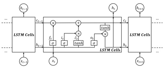 As shown in Figure 2, three gates, called the input gate, the forget gate, and the output gate are placed in an LSTM cell. When information enters the LSTM network, it is judged as to whether it is useful according to the rules. Only the information that conforms to the algorithm authentication will remain, and the inconsistent information will be forgotten through the forget gate. The calculation method for each gate is shown in Equations (1)–(6) [28].