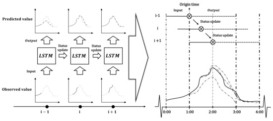 Due to artificial control and natural factors, such as sluices, pumps, rainfall, and tides, the variations in river water levels are highly uncertain [29]. Therefore, it is necessary to consider the rolling forecast method [30,31,32,33]. In this study, the river section water levels were forecast by the rolling forecast method, as shown in Figure 3. At the beginning of each simulation, the most recent observed river water level data is used as the input, the unit state is updated, and the change trend of water level is forecast. The start time of each forecast is recorded as the origin time. Then, the interval between the two origin times determines the rolling interval, and the length of each output data determines the forecast period of each simulation.