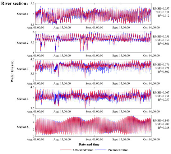 Specifically, the five river sections have different variation rules. Among them, the bottom elevations of river Sections 1 and 2 are relatively high, and the water levels are mainly affected by the water diversion pump station and are between 4.5 m and 5.5 m, and 5.1 m and 5.8 m, respectively. The RMSE, NSE, and R2 of the two sections were 0.057, 0.911, and 0.912, and 0.051, 0.858, and 0.861, respectively. Sections 3 and 4 are located downstream of the whole basin. The bottom elevations of these sections are low and part of the tidal channel. The water level is mainly affected by the gate and tide level along the river and is between 3.3 m and 4.5 m. The RMSE, NSE, and R2 of the two sections were 0.076, 0.771, and 0.802, and 0.067, 0.751, and 0.757, respectively. Section 5 is located on Minjiang River, which is a natural river water level with no regulation of the sluice and pump. The water level is only affected by the tide, ranging from 0.4 m to 5.9 m. The RMSE, NSE, and R2 of Section 5 were 0.149, 0.987, and 0.988, respectively, which showed the best fitting performance.