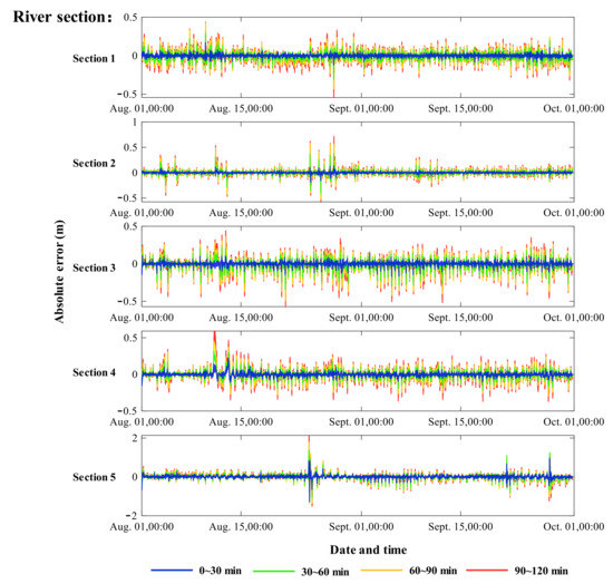 The absolute error of Section 5 is obviously higher than that of the other four sections, which is due to the larger variation range of the water level. However, from the perspective of the change degree, the average error of Section 5 in the next 90–120 min is 2.81 times those of 0–30 min, which are 0.128 m and 0.046 m respectively, while the increase of the other four sections is more than 4 times.