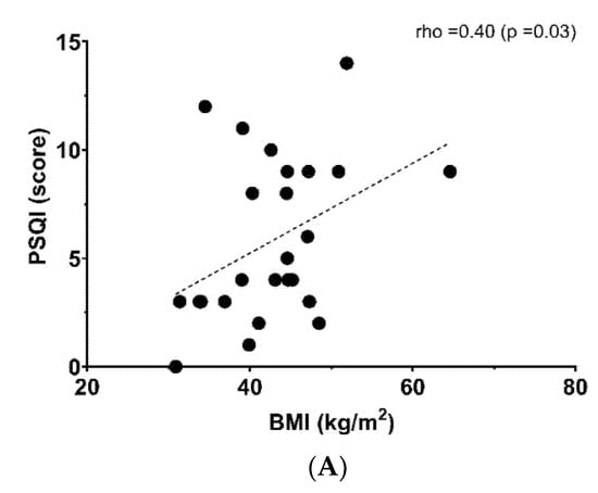 The aim of the present study was to determine the association between sleep quality with MetS markers (i.e., WC, hypertension, elevated TG, low HDL-C, and hyperglycaemia), fitness and body fat in women with severe/morbid obesity. In the present study, poor sleep quality showed an association with body fat and morbid obesity. Previous evidence showed that lack of sleep is a risk factor for obesity, insulin resistance, and type 2 diabetes []; therefore, a short sleep duration and other dimensions of poor sleep quality are associated with body fat []. In this context, it was demonstrated in adult subjects that poorer sleep efficiency is related to higher fat mass []. In addition, a recent study reported that BMI negatively predicted sleep duration and sleep efficiency in Chinese young adults []. Sweatt et al. [] showed that lower sleep quality is associated with elevated visceral adipose tissue, and poor sleep quality was positively associated with fat mass percentage in Spanish subjects []. Similarly, another study reported that fewer hours of sleep may be linked to fat mass index and obesity increase in Korean adults []. Another study showed that body composition of subjects with obesity is related to sleep habit changes (i.e., sleep quality and quantity), and the results of this study also indicated that sleep disorders such as obstructive sleep apnoea are associated with sarcopenic obesity, and nocturnal hypoxia is linked to obesity [].