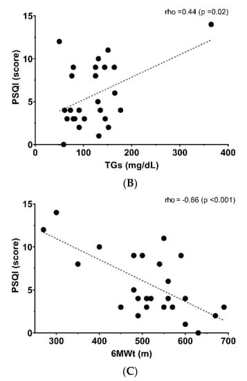 Relationship between poor sleep quality score and (A) body mass index (BMI), (B) triglycerides (TGs) and (C) six-minute walking test (6MWt).