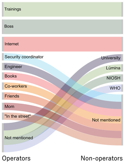 Operators and non-operators received health information from different sources (Figure 1). Operators were more likely to get information from informal sources such as the internet, a friend, a colleague, or a family member. Non-operators were more likely to say they were trained at work or had used a formal source such as materials from the National Institute for Occupational Safety and Health (NIOSH), the World Health Organization (WHO), or Lúmina, a Colombian company that joins different companies in the lighting sector and works as a source for information on recycling lighting material.