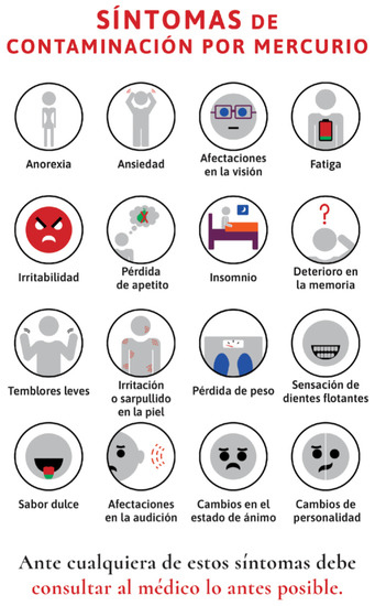 Public health infographics designed based on the findings of this study to visualize potential symptoms related to mercury exposure. Infographic created by Maria Carolina Cuestas Moncada, Juan David Reyes Estupiñan, and David Felipe Salazar Chiguasuque and reproduced with permission.