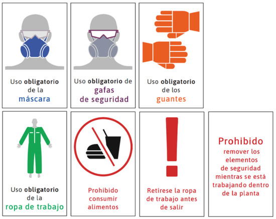 Public health infographics designed based on the findings of this study to communicate the importance of PPE when working with mercury. Infographics highlight (left to right) masks, safety glasses, gloves, work clothes, eating prohibited, removal of work clothes before leaving work, and the prohibited removal of personal protective equipment while working. Infographics created by Maria Carolina Cuestas Moncada, Juan David Reyes Estupiñan, and David Felipe Salazar Chiguasuque and reproduced with permission.