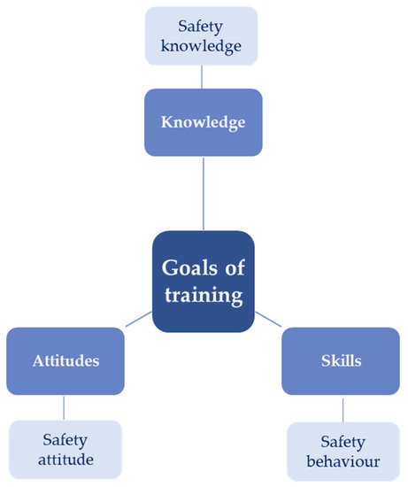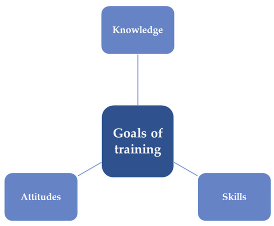 Training is a planned process of changing the action/behavior of a specific group of employees built by filling the competence deficit in terms of attitudes, knowledge and skills of people, ultimately giving identifiable business benefits to the company [6,7]. There are three main goals of training: the acquisition of knowledge, skills and attitudes. The first objective refers to the acquisition of new knowledge and the expansion of existing knowledge in trainees, and the knowledge gain can be measured by a pre-training and post-training test. The second objective refers to the acquisition of skills or the improvement of existing skills, which can be seen through the change in a person’s behavior after training. Finally, the third objective refers to attitude, which is what the participant feels after the training, including motivation and self-efficacy [8,9]. Figure 1 shows the main objectives of training.