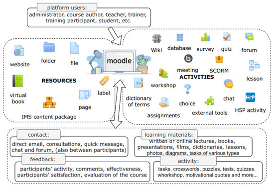 Moodle (Modular Object-Oriented Dynamic Learning Environment) is an educational platform that provides a robust, secure and integrated system for creating and administering personalized educational courses [40]. Its purpose is to support the didactic and methodological aspect of education. According to the source [41], the Moodle platform is successfully used in 247 countries, by nearly 271 million users. Moodle is a platform provided under an Open-Source license, so every user has access to the source code and can modify it according to their needs [42]. The construction, administration and use of the platform are simple and intuitive, requiring only basic web browser skills. The basic unit of the Moodle platform is a course, in which components in the form of resources (static educational content) and activities (activation and action-enabling content) are placed sequentially. Based on sources [43,44] and the authors’ experience, Figure 3 shows the range of available course content and basic structure.