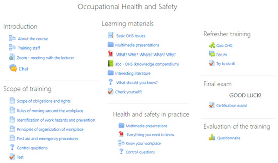 For the purpose of conducting occupational health and safety training in the time of restrictions related to the COVID-19 virus pandemic, a course was developed using the Moodle platform that allows the conducting of training remotely. The course was divided into seven basic parts. A pictorial structure of the course is shown in Figure 4.