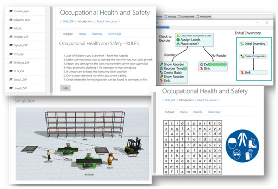 The created course was implemented during health and safety training conducted at a selected manufacturing company. A total of 124 employees participated in the training. The training began with a test to verify knowledge of occupational health and safety. The duration of the training, from enrolling participants to obtaining certificates, was not limited in any way. This means that a participant in occupational health and safety training can solve the mandatory tasks and take the final exam at any time. Obtaining the certificate entitles them to work in the company. The course participant has the opportunity to prepare for the final exam independently and effectively by studying specially prepared materials and solving prepared tasks. Examples of the learning materials are shown in Figure 5.