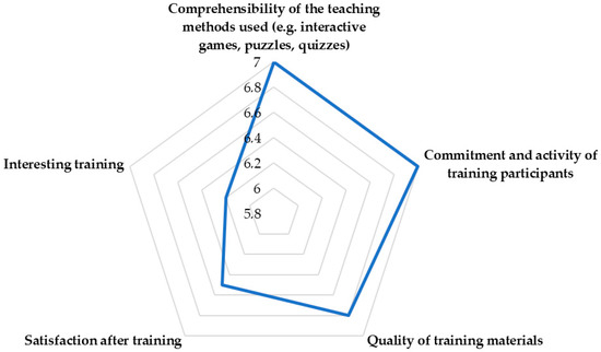 The responses obtained showed that all respondents rated the attractiveness of the training and the involvement and activity of participants in the training at the maximum number of points. Figure 6 shows the average score from the responses obtained by the respondents after the training.